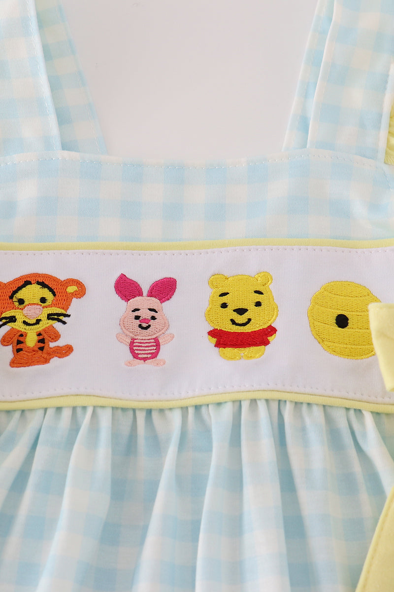 This charming blue gingham dress features playful character embroidery and delicate ruffle details, adding a fun and whimsical touch to any outfit. Perfect for sunny days and special occasions, its lightweight fabric ensures comfort while the ruffles bring a flirty, lively vibe. A delightful choice for those who love a mix of classic patterns with a spirited twist.