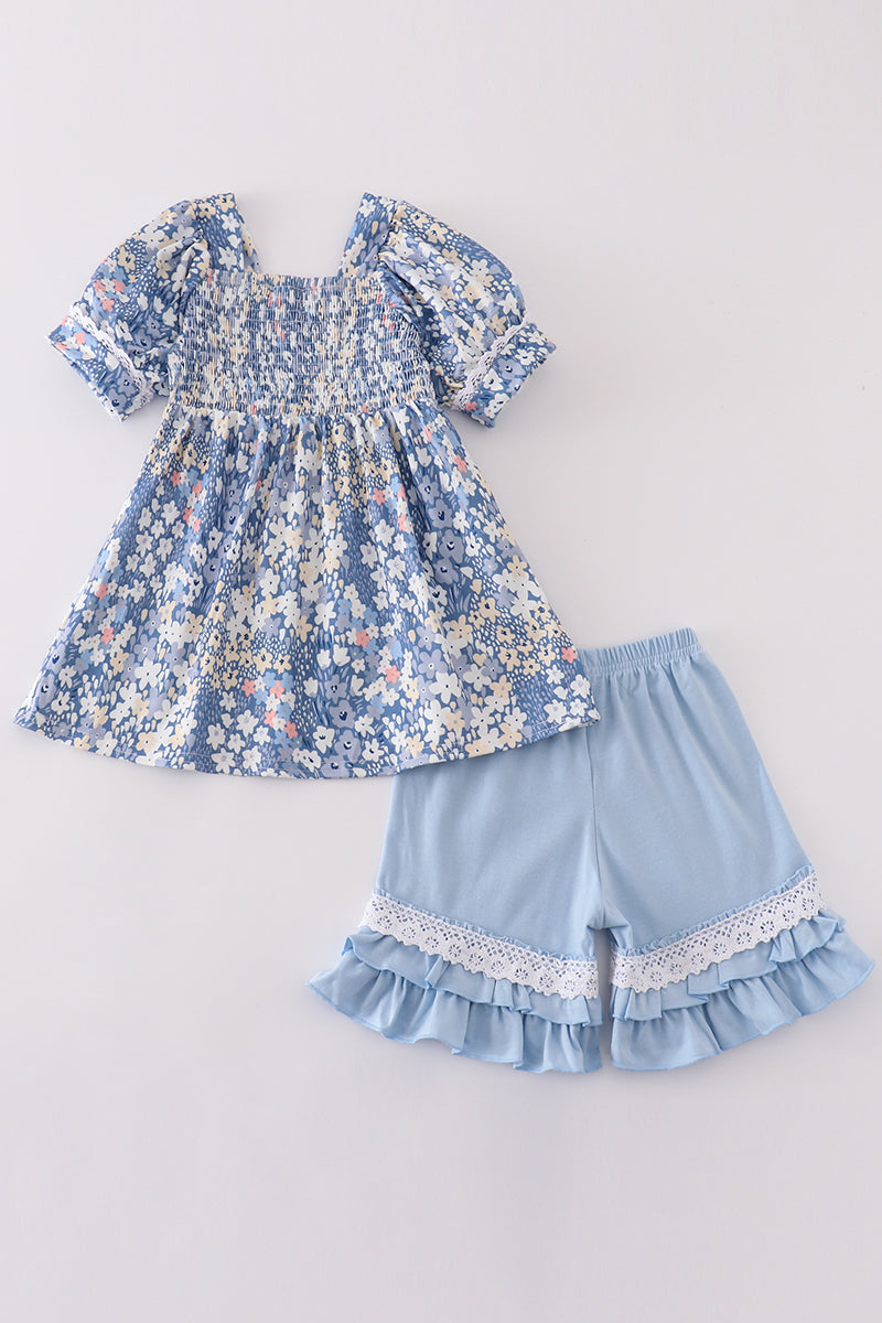 Oh so fancy, yet oh so fun! This blue delicate floral smocked girl set will have your little one feeling like a fashionista. Featuring intricate smocking and delicate floral print, this set is perfect for any special occasion. Comfort and style for your little fashionista!