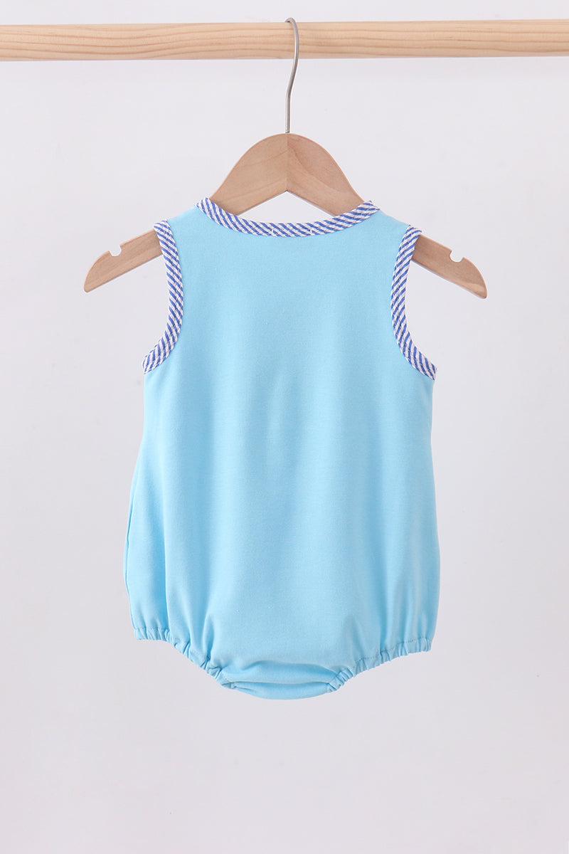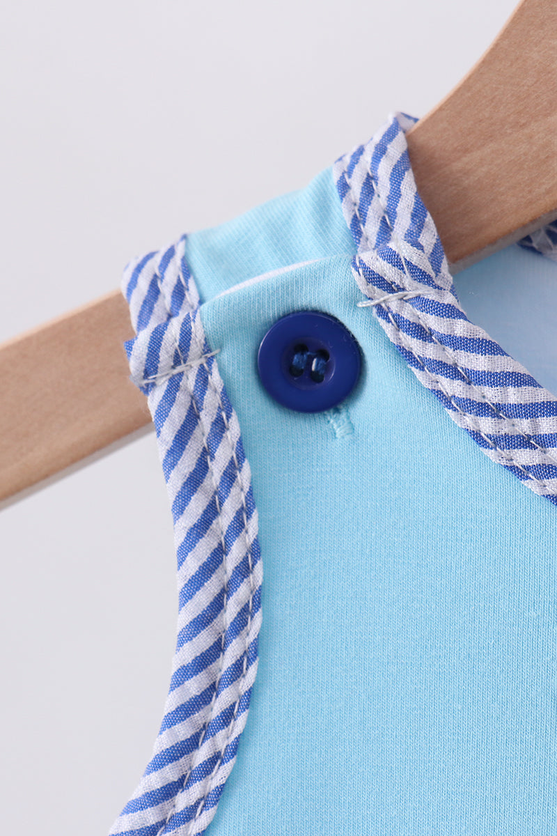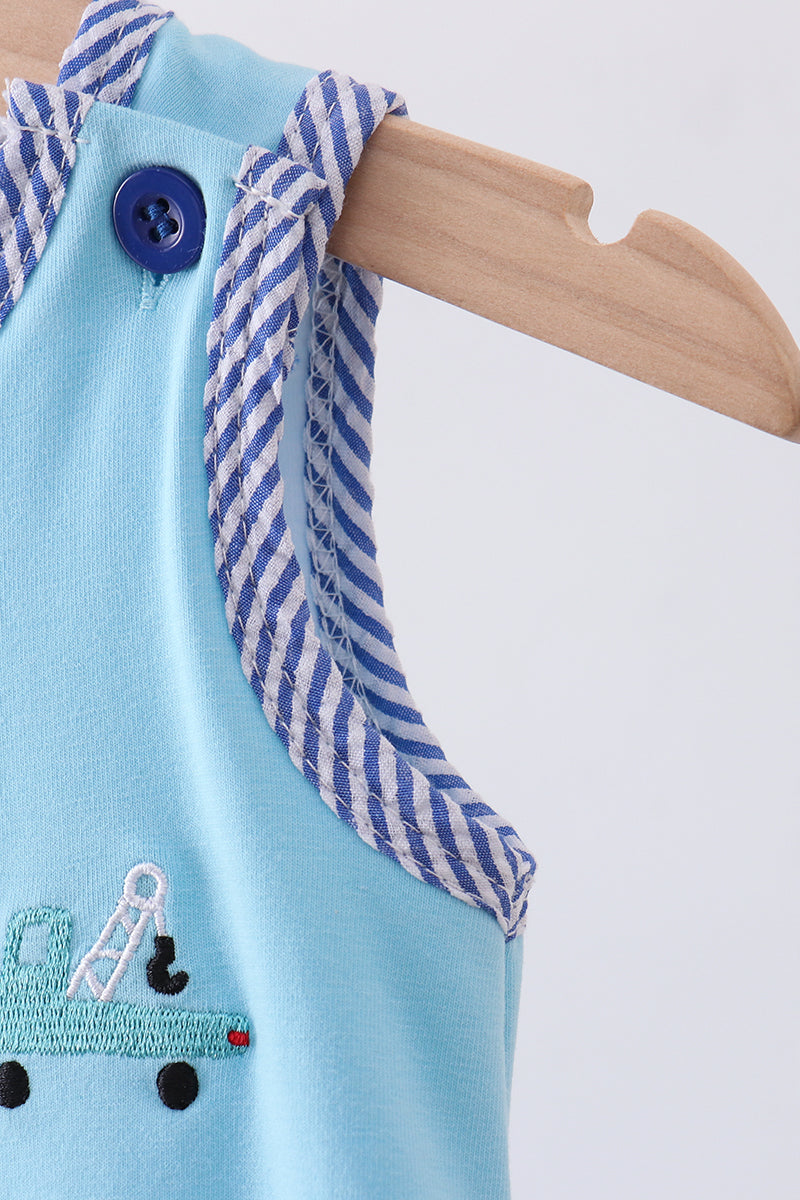 Buckle up for adorable style! This charming bubble features a playful blue truck embroidery set against classic seersucker fabric. The textured weave keeps things cool and comfy, while the whimsical truck design adds personality to any outfit. Perfect for little ones who love vehicles and fun details. A delightful pick for playtime or everyday wear!