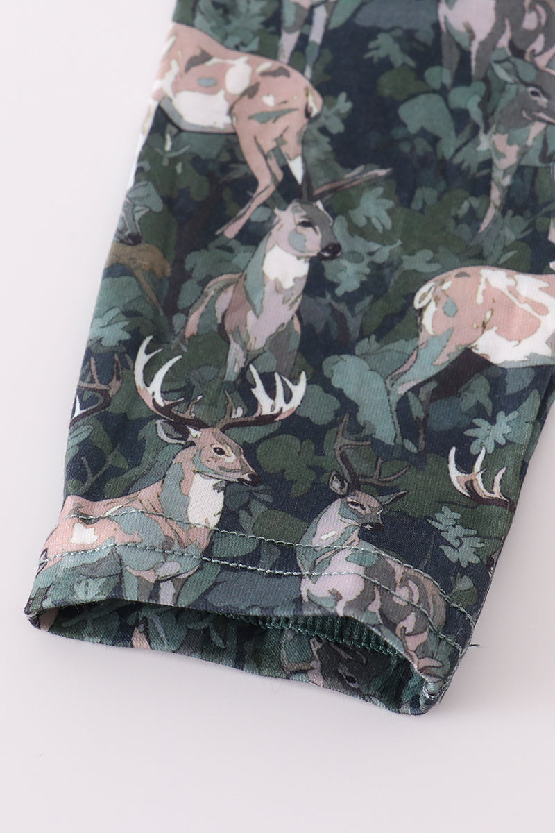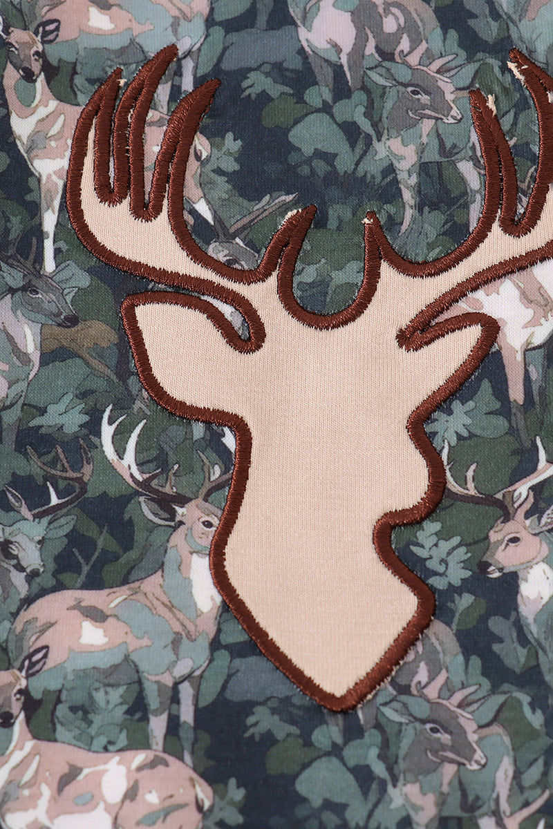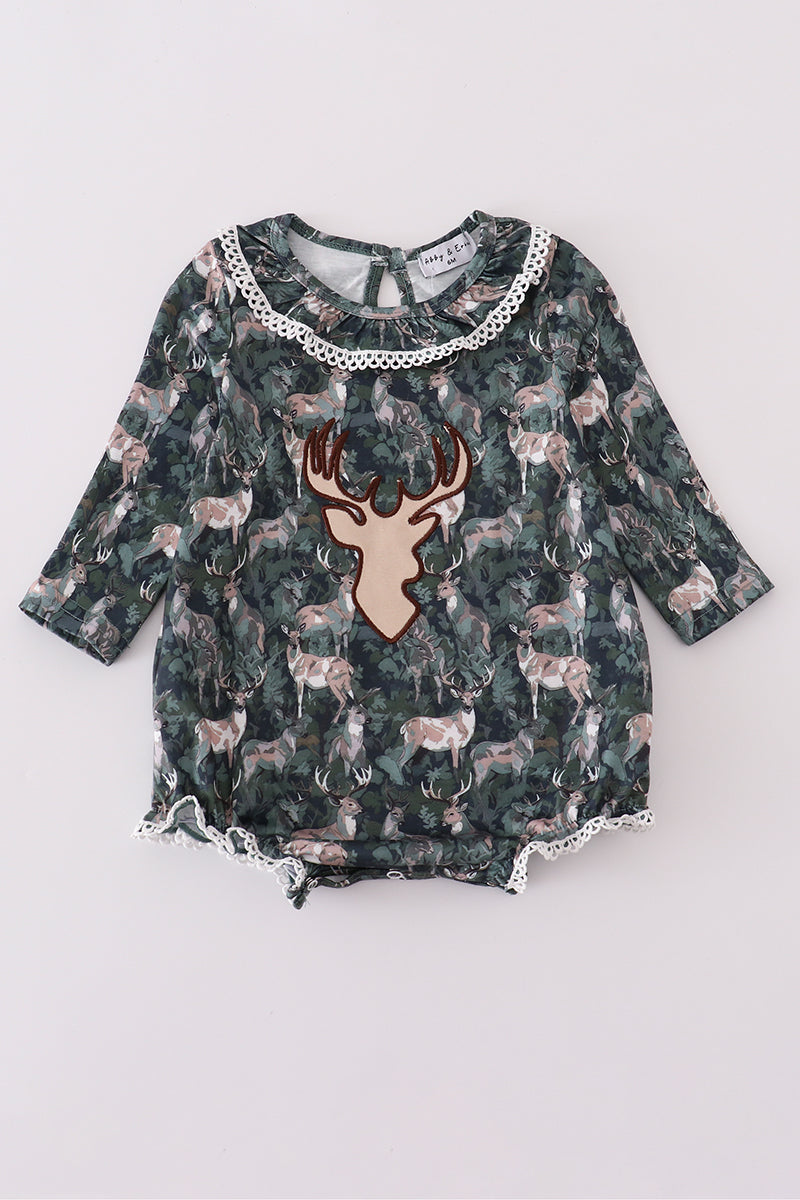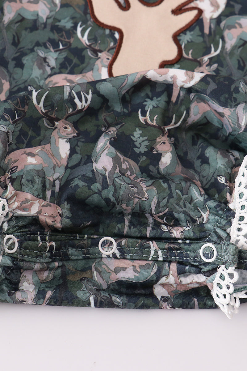 Get ready for outdoor adventures with this playful camouflage hunting deer applique ruffle bubble! Featuring a charming deer design and cute ruffle details, it adds a fun twist to classic camo style. Comfortable and stylish, it's perfect for young explorers who want to blend in while standing out.