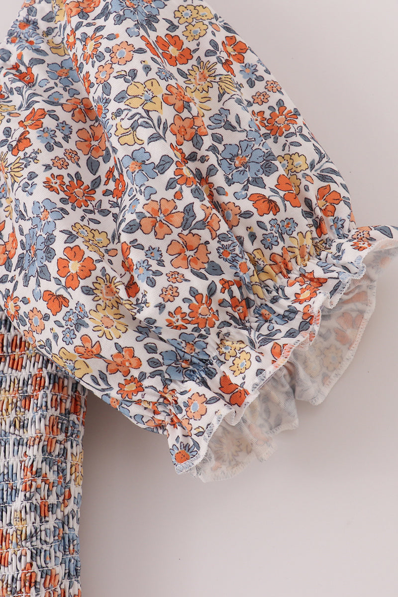 Embrace cozy charm with this playful fall floral print smocked mom dress. Its smocked bodice offers a flattering fit while the vibrant floral pattern brings a touch of autumn whimsy. Perfect for casual outings or festive gatherings, this dress combines comfort and style effortlessly.