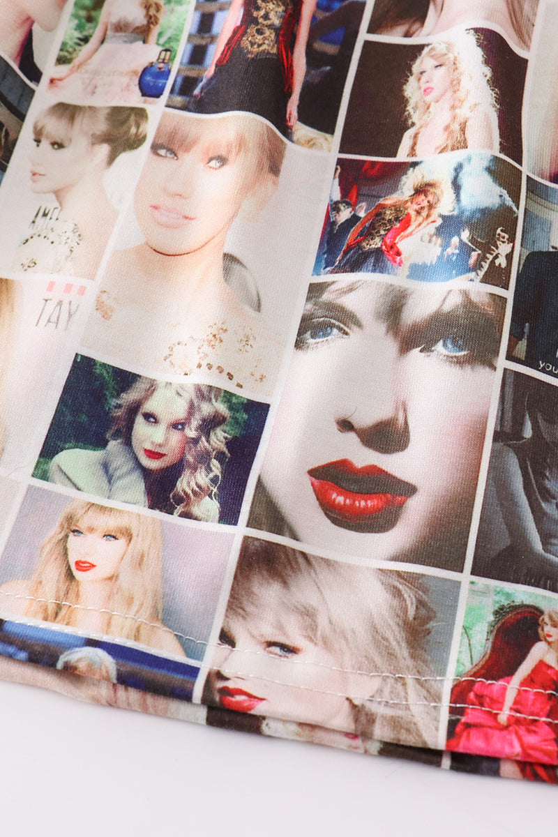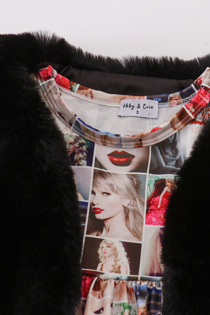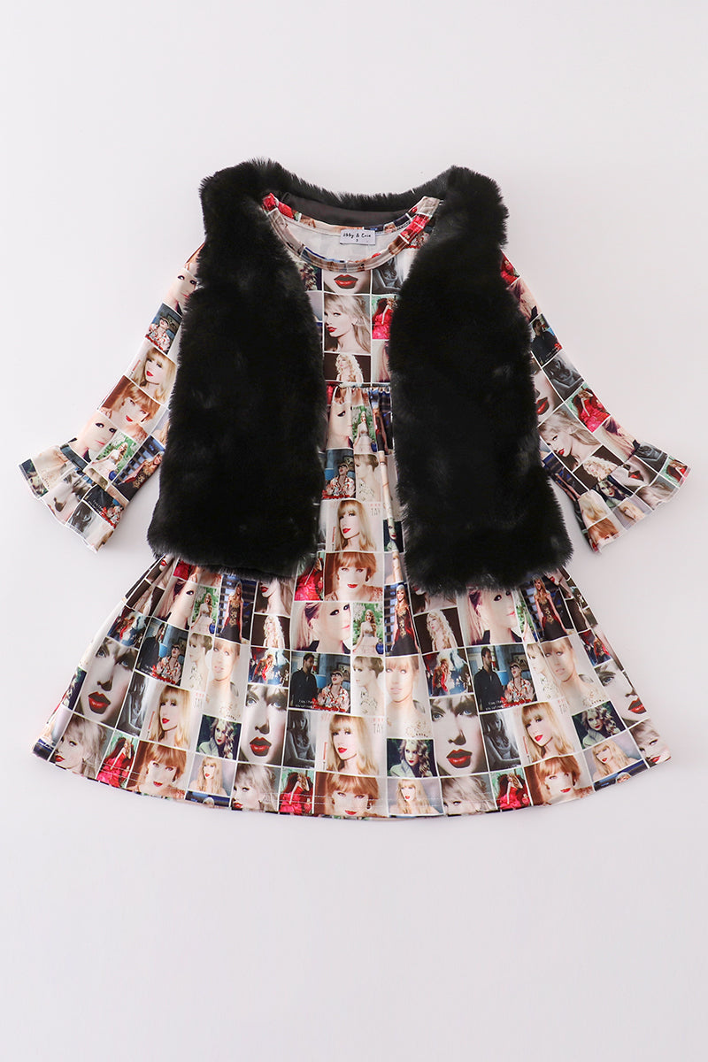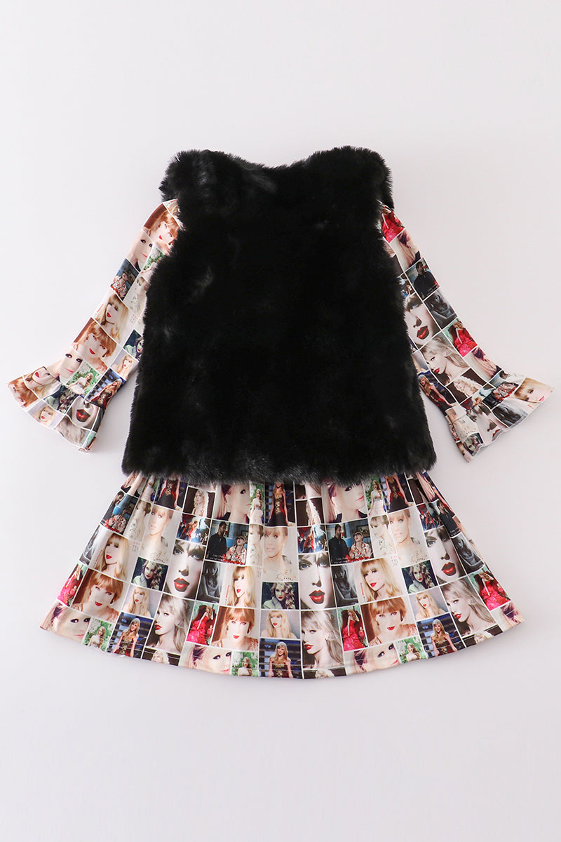 Stay cozy and stylish in this unique fur vest and fan print dress set. Perfect for music lovers, this set adds a playful touch to any outfit. Get ready to rock and roll in this quirky ensemble!