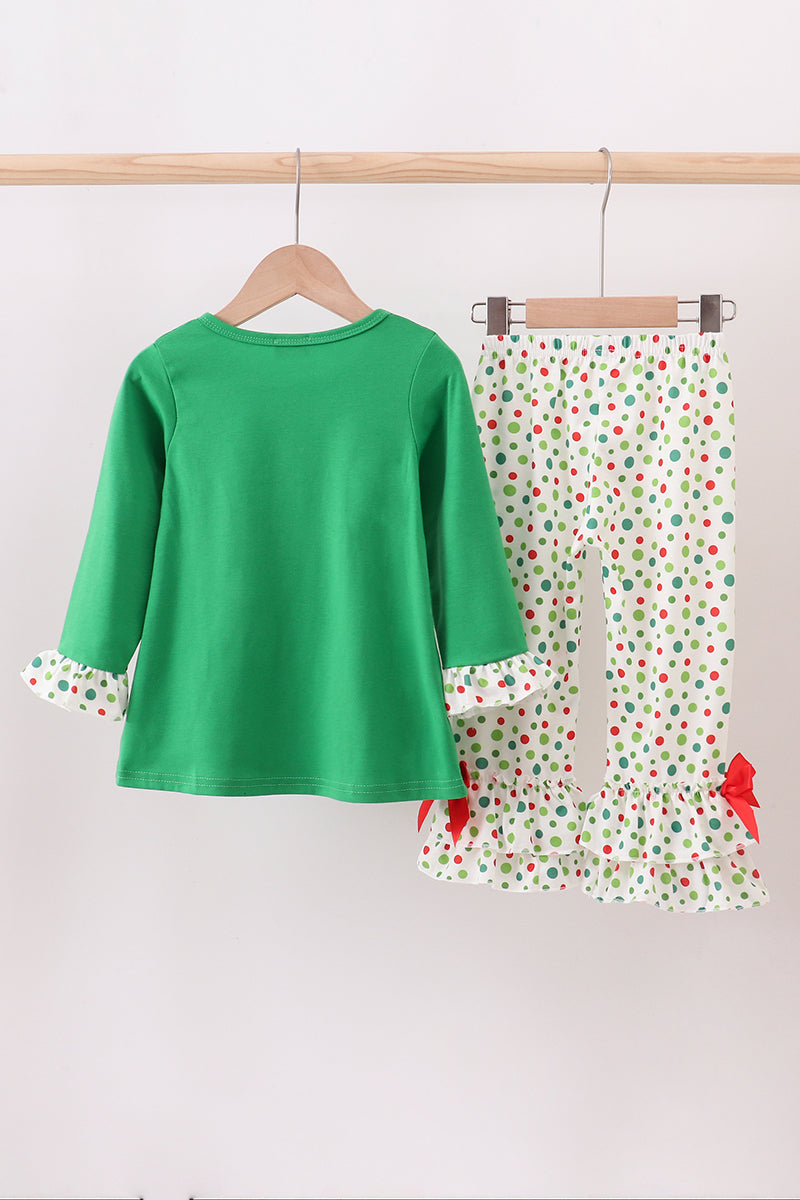 Bring festive cheer with this Green Santa Claus Applique Ruffle Pants Set. Featuring a playful Santa applique and charming ruffle details, this set adds holiday fun to any outfit. Soft and comfortable, it’s perfect for celebrating the season in style and spreading smiles wherever you go.