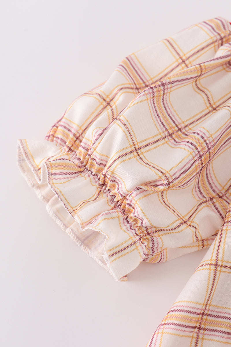 Khaki farm embroidery smocked plaid dress