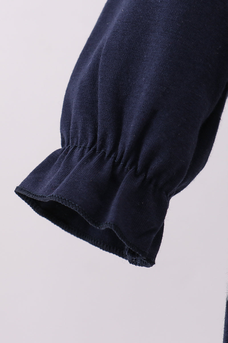 Bring festive cheer to your little one’s wardrobe with this Navy Christmas Santa Cookie Milk Embroidery Ruffle Bubble. Featuring charming embroidered holiday details and playful ruffles, this bubble romper combines comfort with seasonal fun. Perfect for holiday photos or cozy family gatherings, it adds a sweet and joyful touch to any celebration.