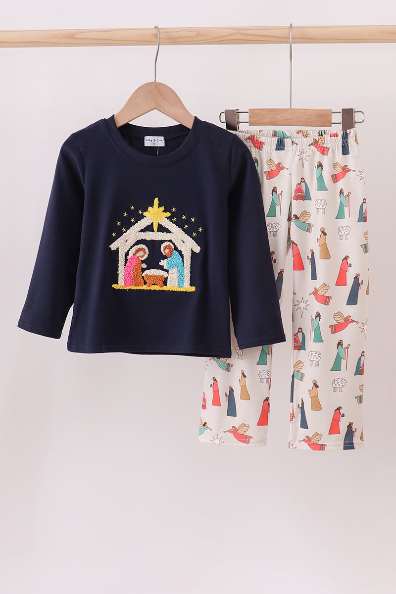 Dress your little one in cozy charm with this Navy Nativity French Knot Pants Set. Featuring a playful navy design with delicate French knot details, these pants offer both comfort and style for holiday fun. Soft fabric ensures all-day wear, while the festive motif brings warmth to any occasion. Perfect for tiny tots ready to celebrate with a touch of whimsy!