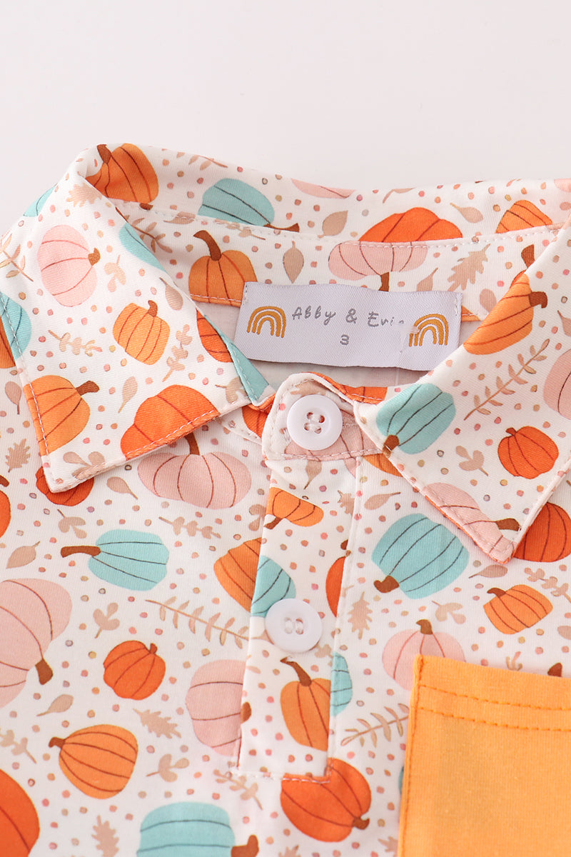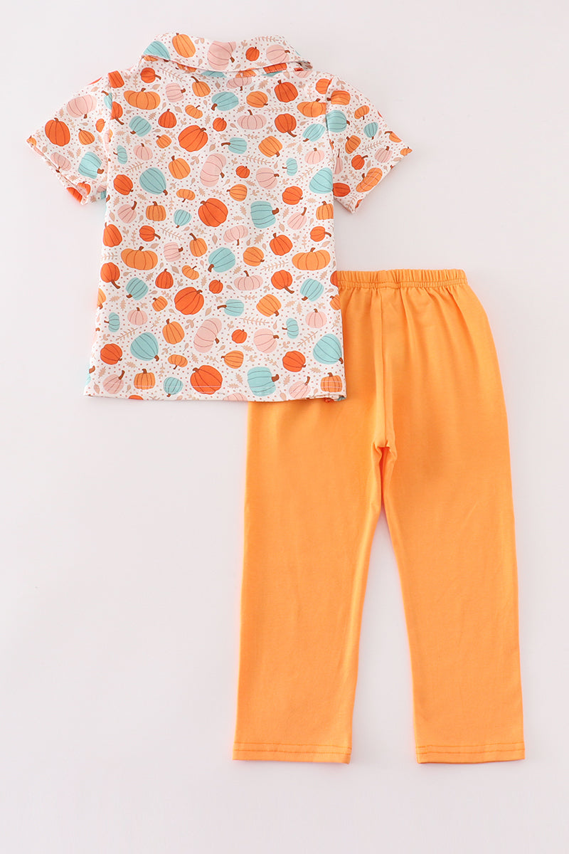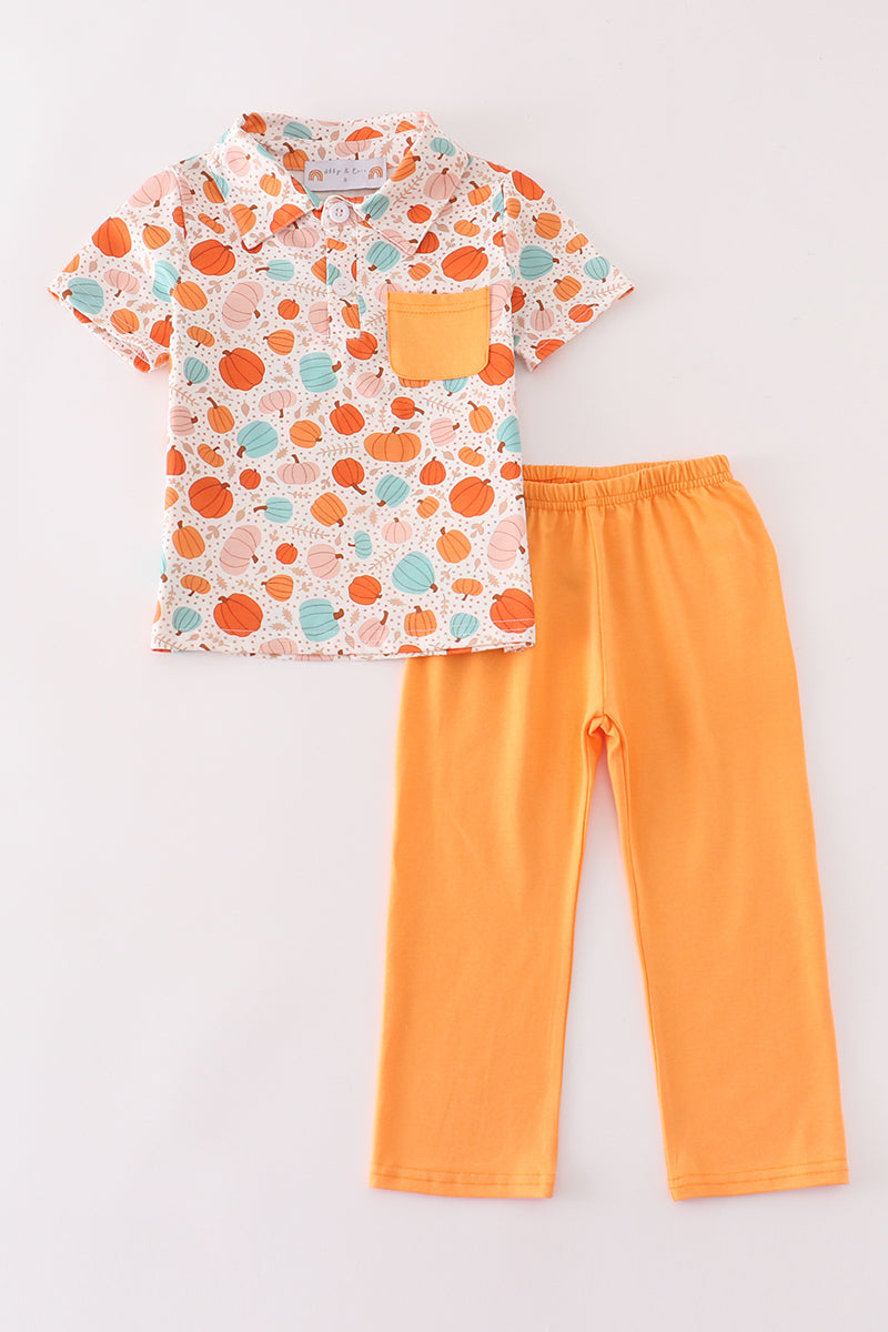 Add a pop of fun to your little boy's wardrobe with this quirky orange pumpkin print set. Perfect for Halloween or any autumn day, this set will have your little one looking stylish and playful. (Just don't try to carve these pumpkins!)