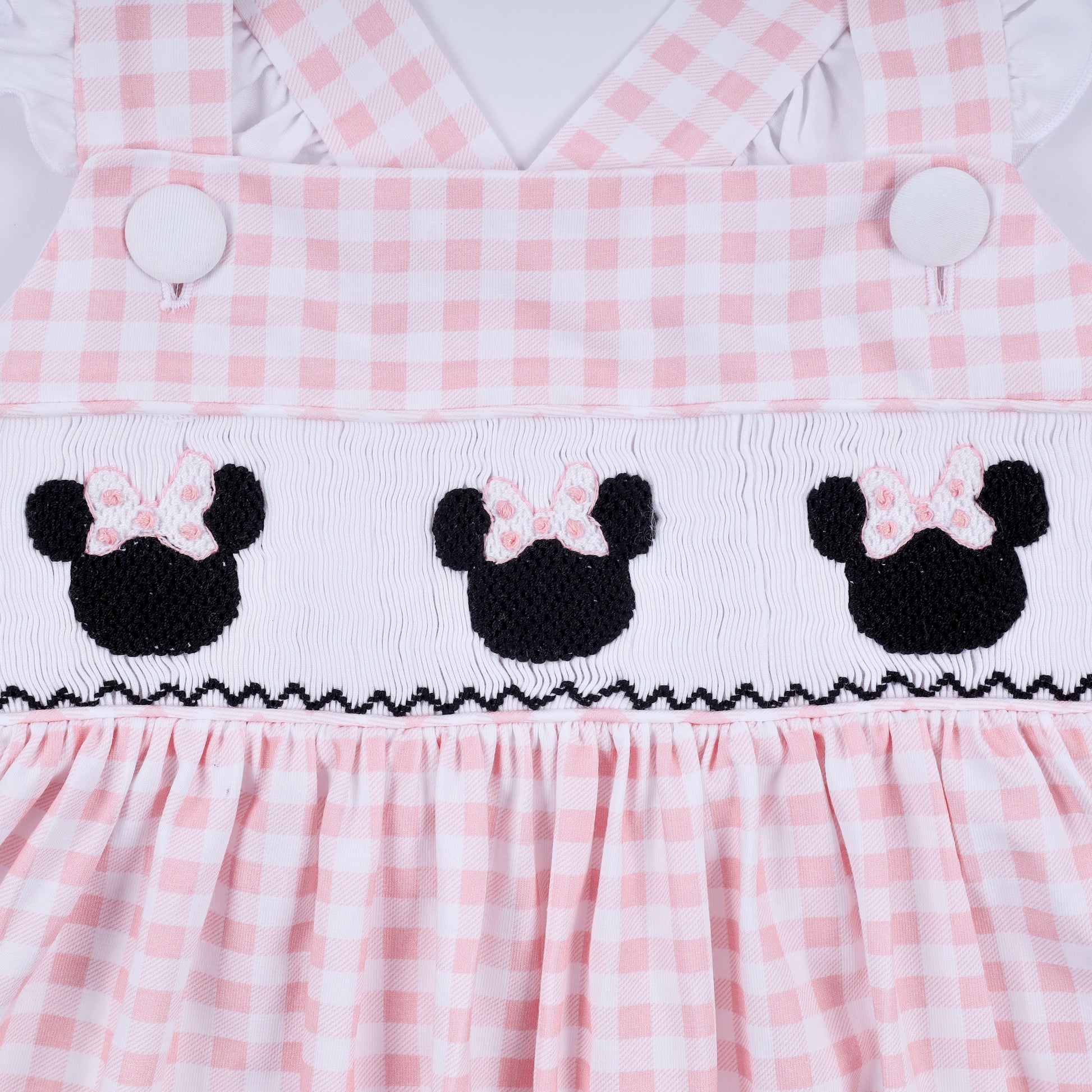 Meet the dress that's as charming as it is twirl-worthy! This pink gingham ruffle dress features adorable character details and hand-smocked craftsmanship that adds texture and personality. The playful ruffles dance with every movement, while the classic gingham pattern keeps things sweet and timeless. Perfect for special occasions or everyday adventures, this dress combines whimsical character charm with quality construction that parents love. A delightful choice for little ones who love to express their unique style.