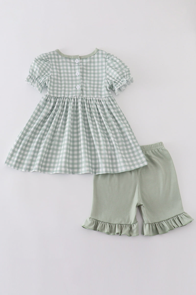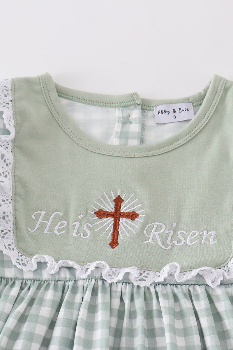 Celebrate Easter with our Sage "He Is Risen" cross embroidery girl set! This adorable set features a sage green color and beautifully embroidered cross, perfect for any holiday occasion. Spread the joy and hope of Easter with this unique and playful outfit.