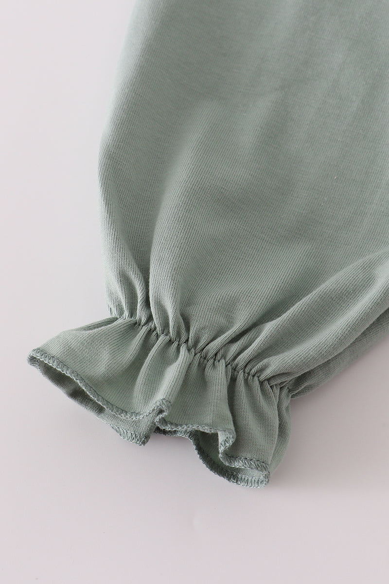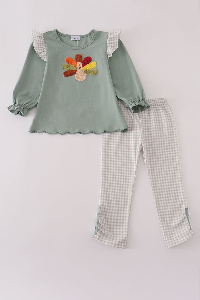Add a touch of whimsy to your little one’s wardrobe with the Sage Turkey French Knot Ruffle Pants Set. Featuring charming ruffle details and a soft sage hue, this playful outfit combines comfort and style for everyday adventures. Perfect for twirling, exploring, and making memories in cozy, cute fashion.