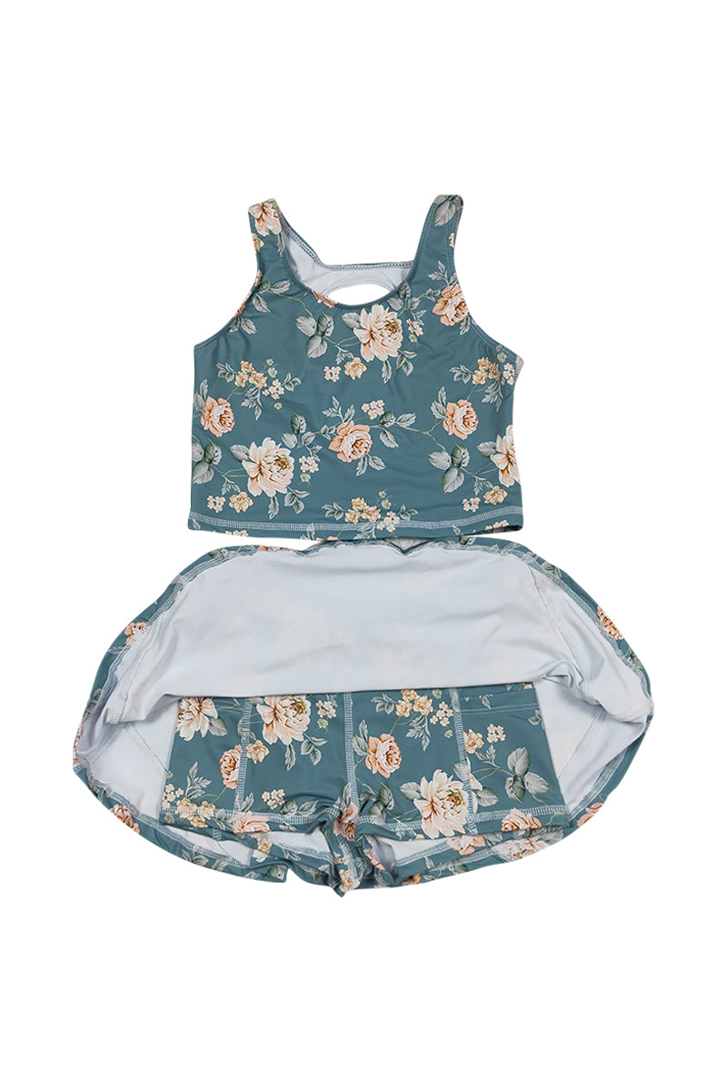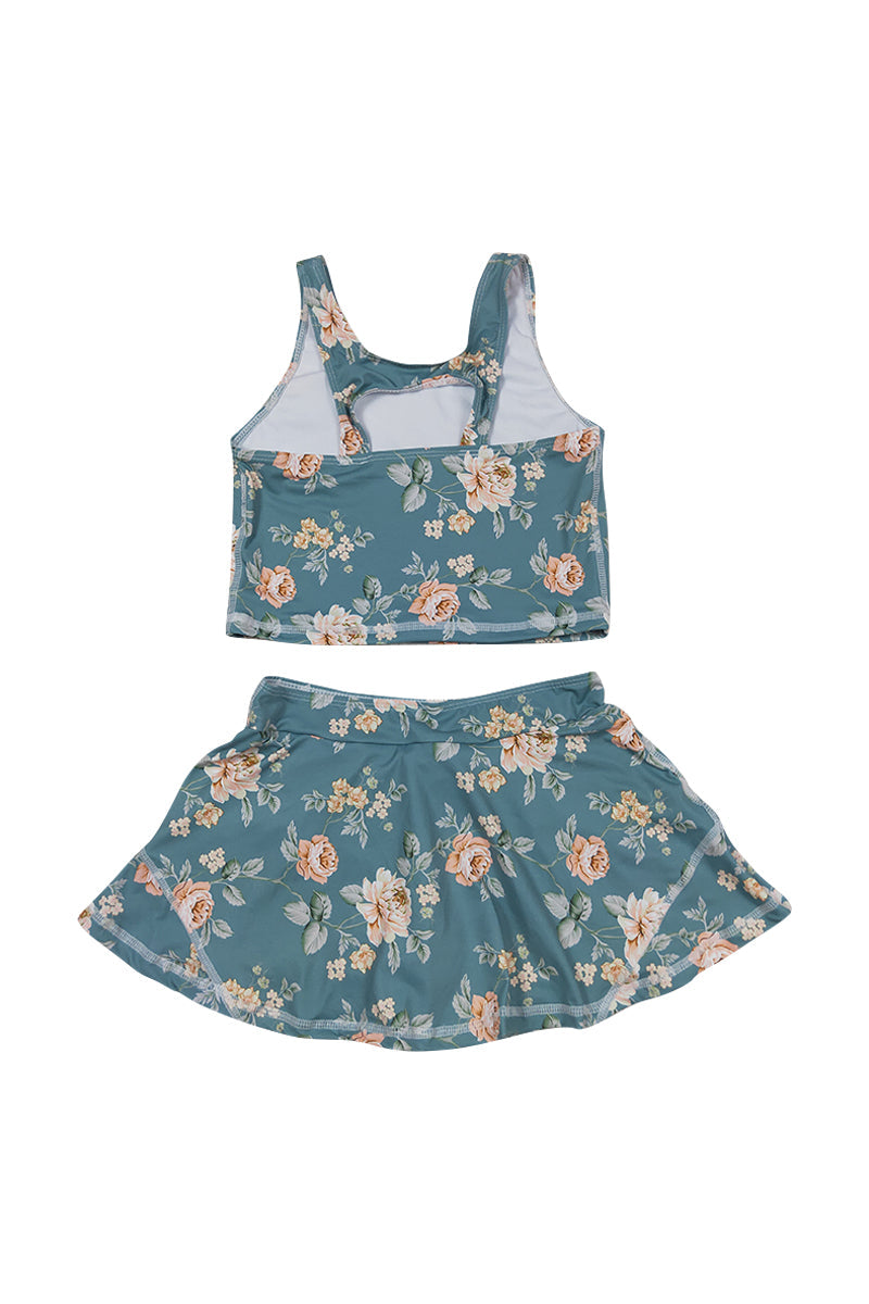 Teal floral print girl 2pc swimsuit